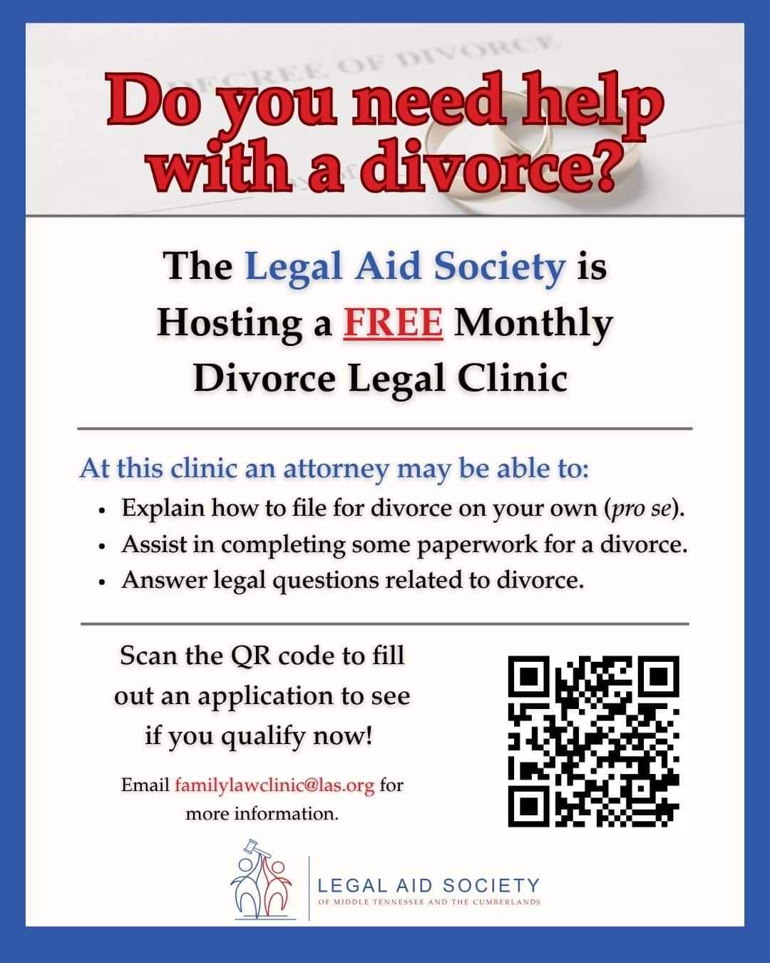 This clinic is intended for individuals seeking divorce who may not have access to a private attorney. Eligibility is based on income and other qualifying factors.