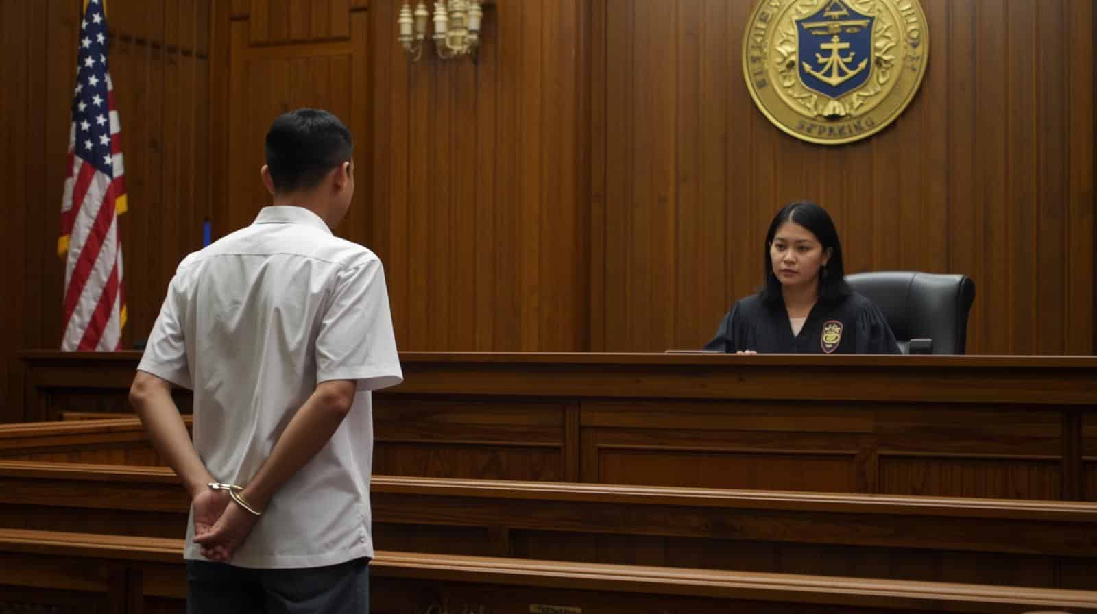 Courtroom With Man In Handcuffs Behind His Back, Standing In Front Of A Judge.